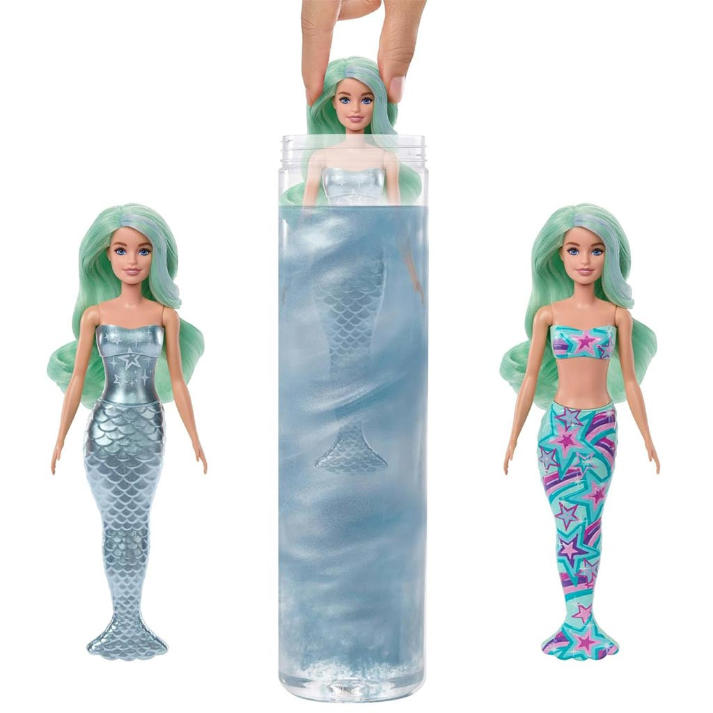 Merülj el a Barbie: Color Reveal meglepetés Sellő baba varázslatos világában, ahol minden csomag egy izgalmas kalandot rejt! A szett tartalma egy titokzatos, ezüstszínű Barbie baba, amelynek valódi külsejét csak a víz leplezi le. Egyszerűen töltsd meg a csomagolásként is szolgáló csövet vízzel, majd merítsd bele a babát, és figyeld, ahogy az ezüst festék feloldódik, felfedve a baba egyedi megjelenését. Minden egyes baba más és más, így a gyerekek sosem tudhatják előre, melyik varázslatos sellőt kapják meg!