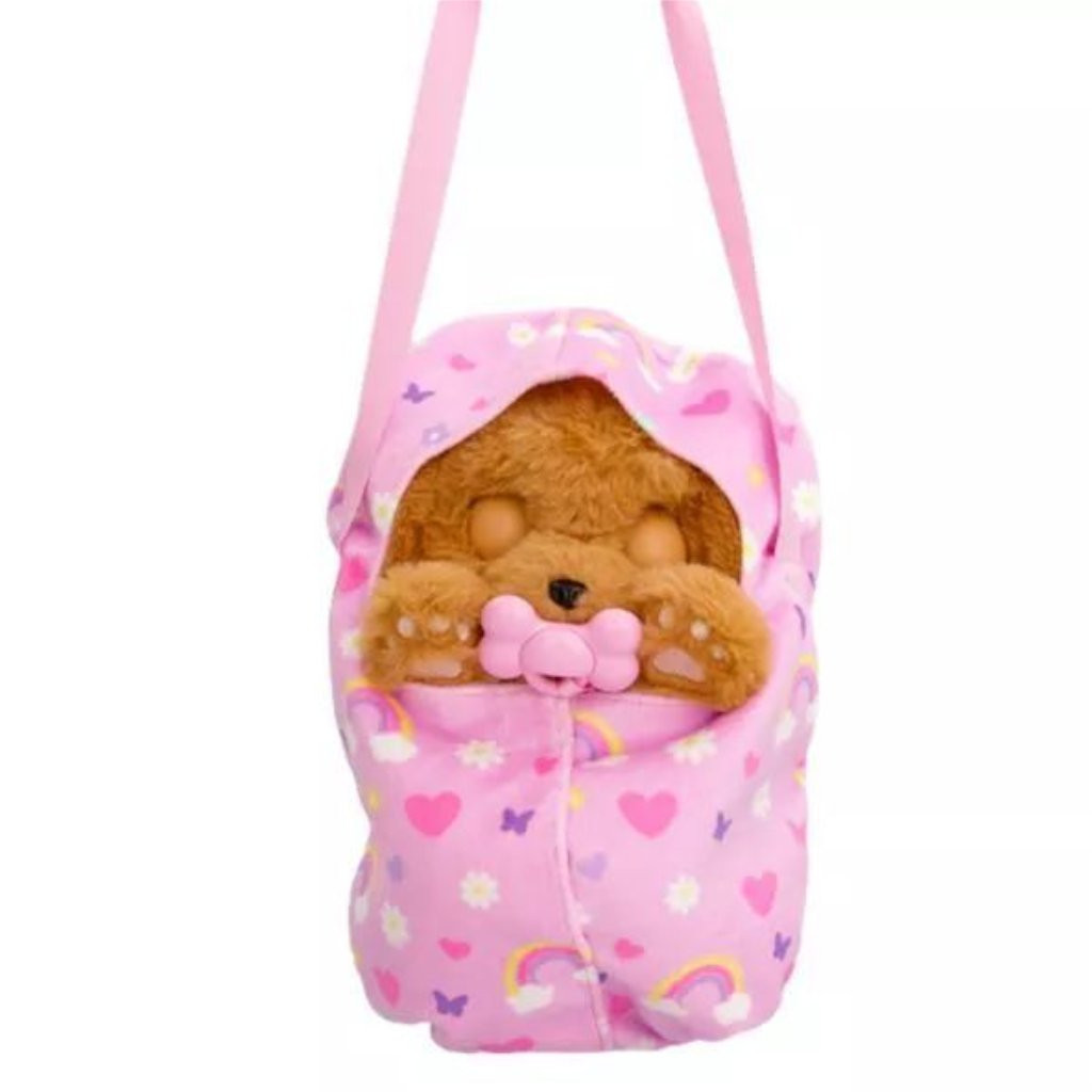 A játékhoz tartozik egy vállra akasztható hordozó is, így a gyerekek bárhová magukkal vihetik őt, és együtt fedezhetik fel a nagyvilágot.