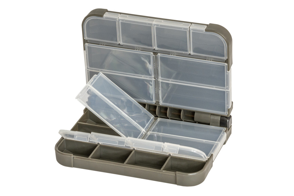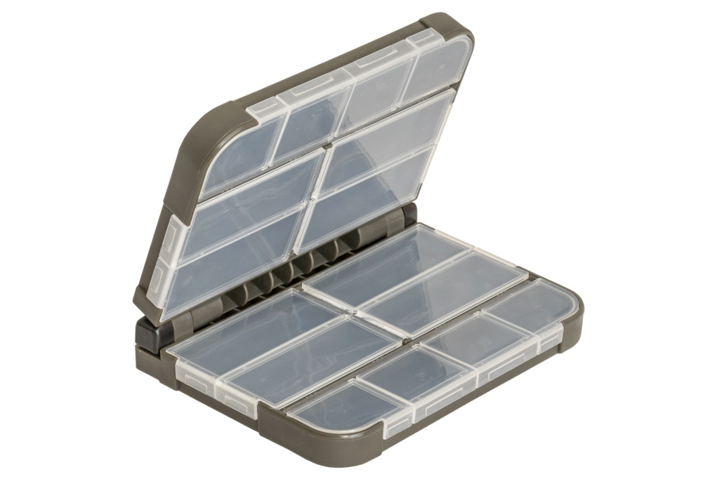 Horgok, kapcsok, forgók és egyéb apró kiegészítő tárolására alkalmas, lepkeszerűen kihajtható aprócikkes doboz. A különböző méretű, összesen tizenhat darab rekesznek és a jól záródó, áttetsző fedélnek köszönhetően a benne elhelyezett felszerelés könnyen áttekinthető. Méreténél fogva akár a mellényzsebben is elfér. Őrök darab, olyan horgászoknak ajánljuk, akik szeretik átláthatóan tárolni a horgászfelszerelésüket.