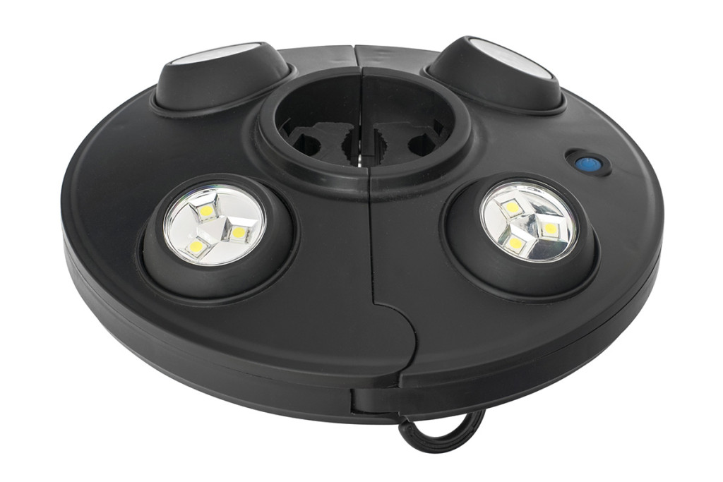 A lámpatestbe négy darab tetszőlegesen, egymástól függetlenül dönthető világító fej került, melyek mindegyikét 3-3 darab nagy teljesítményű LED-del szerelte fel a gyártó. Energiaellátását 3db AA elem biztosítja. A kibocsájtott fényerősség a bekapcsoló gomb többszöri benyomásával négy fokozatban állítható. Praktikusan, többféleképpen is rögzíthető. Egyfelől a lámpatest hátoldalán lévő kihajtható akasztókkal, másrészt szintén a hátoldalon lévő gomb megnyomásával, a lámpatest szétnyitható, majd összezárva a rugós befogó pofák segítségével akár a sátortartó rúdra is felhelyezhető. A dönthető világító fejeknek köszönhetően, mindig a megfelelő helyre fog világítani.