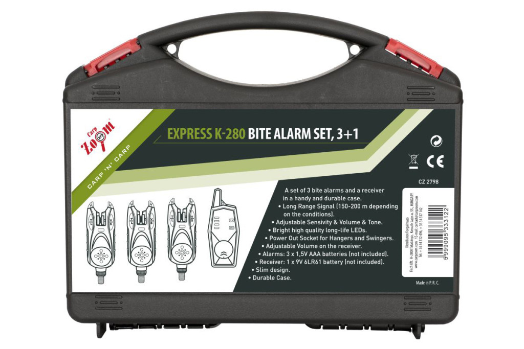 A többnapos vagy éjszakai horgászatok nélkülözhetetlen kelléke a megfelelő minőségű, megbízható kapásjelző, mely a legapróbb mozdítást is érzékeli. Erre jelent kiváló alternatívát a CarpZoom Express K-280-as szettje, melynek kisméretű, merevfalas kofferében három különböző színű leddel felszerelt kapásjelző és egy 150-200 méter hatótávolságú vevő kapott helyet. A vevő kapás esetén az aktív jelző színével villog, így már a sátorban eldönthető melyik boton van kapás. Ha a hal időközben otthagyná a csalit, a kb. 25 másodpercig villogó jelzőfény akkor is tudja velünk melyik pálcán volt akció. A jelzőt többpontos, mágneses érzékelővel látta el a gyártó, így a finomabb mozdításokról sem maradunk le, érzékenysége az „S” gombbal szabályozható. Igény esetén az „L” gomb megnyomásával aktiválható az éjszakai jelzőfény. A jelzőhöz természetesen ledes swinger is csatlakoztatható. Bojlisoknak, klasszikus fenekező horgászoknak és éjszakai rablóhalas horgászoknak is tökéletes választás. Vevő: 3 db AAA, jelző: 1 db 9V (6LR61).