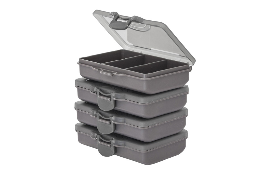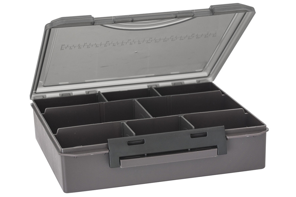 A felszerelés jól rendszerezett tárolására kialakított, 23 x 20 x 6 cm-es doboz, melynek belső osztása igény szerint alakítható. Az apróbb kiegészítők, horgok, kapcsok és forgók elhelyezésére 4 darab 10 x 6.5 x 2.5 cm-es doboz áll rendelkezésünkre, melyek három, négy hat, illetve nyolc fakkosak. Mind a nagyobb, mind a kisméretű dobozokra strapabíró csat került, mellyel tökéletesen zárhatóak. Anyaga masszív, az áttetsző fedélre praktikus méretskála került. Kiváló választás minden olyan horgásznak, aki szereti rendben, áttekinthető módon tárolni a felszerelését.