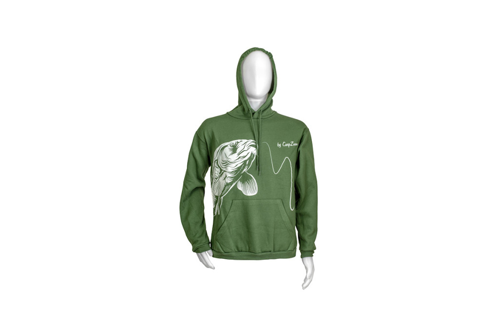 Sötét zöld színű összehúzható kapucnis, amit kedvenc halunk rajzával díszítettünk. Elengedhetetlen kenguru zseb került a pulcsira, ahol hidegben a kezünket melegíthetjük. Az anyagfelhasználásnál elsődleges szempont volt, hogy horgászatra a legalkalmasabb pulóvert tudjuk megalkotni. Az ujjak végére és a pulóver derekát gumis erősített anyaggal láttuk el. A széles méret választéknak köszönhetően minden sporttársunk megtalálja magának a megfelelőt.