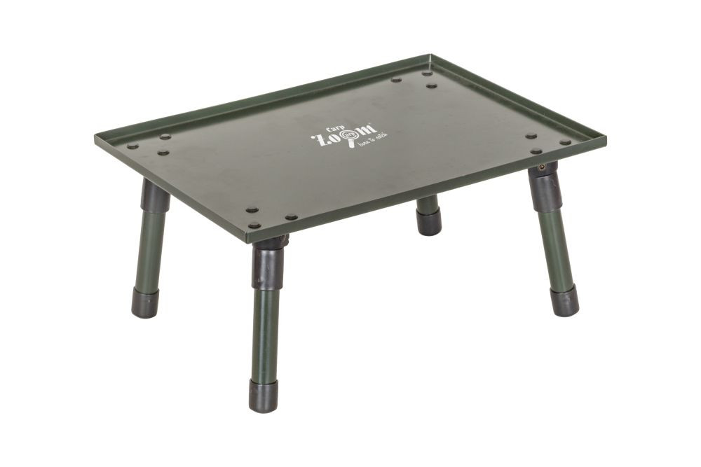 Kisméretű, fém, akár a hátizsákban is szállítható csalizó asztal. Mérete 34×26 centiméter, így alkalmas a használt csalik, egy doboznyi bekevert etetőanyag, csúzli, horogszabadító és egyéb szükséges felszerelés tárolására. Peremes kialakításának köszönhetően a rajta lévő apróbb kiegészítők sem gurulnak le róla. 15 centiméter hosszú lábai egy mozdulattal kinyithatóak. Használatával kényelmesebbé tehetjük a horgászatot, de akár a sátorban is használható az irataink, telefon és a reggeli tea vagy kávé tárolására. Remek alternatíva abban az esetben is, ha csak korlátolt mennyiségű felszerelést vihetünk magunkkal. • Mérete: 34×26 cm. • Szállítási mérete: 34x26x3,5 cm. • Súlya: 670 g.