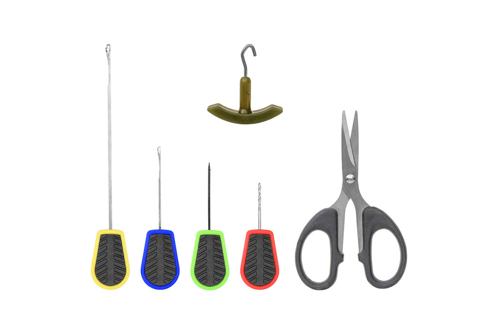 Praktikus, háromféle fűzőtűből, bojlifúróból, csomótesztelőből és egy ollóból álló szett. A fűzőtűk között biztonsági heggyel ellátott és anélküli is helyet kapott, melyekkel lágy és keményebb pelletek, PVA csomagok és bojlik is könnyedén felfűzhetőek. Az olló fonott és monofil zsinór vágásához is használható. Mind a bojlis, feeder és klasszikus fenekező horgászat során is hasznos kiegészítő, így érdemes mindig a táskában tartani.
