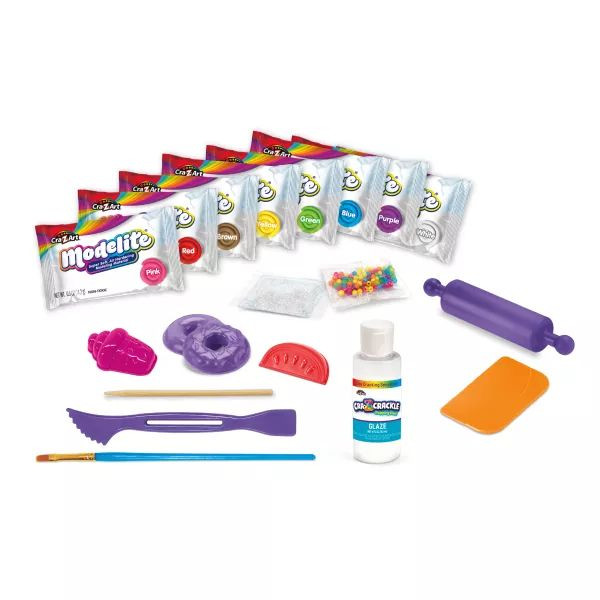 A Cra-Z-Art Create & Crack Sütigyár szettjével a gyerekek megnyithatják saját édességgyárukat és számtalan ínycsiklandozóan kinéző gyurmafinomságot formázhatnak meg, ráadásul ha elkészültek, szét is roppanthatják azokat! A készletben különböző színű gyurmák, egy flakon máz, díszítőeszközök (pl. csillámpor, gyöngyök) valamint különféle formázóeszközök, többek között egy sodrófa, egy pizzavágó, 4 formakiszúró, fapálca, és egy műanyag kés is rejlik.