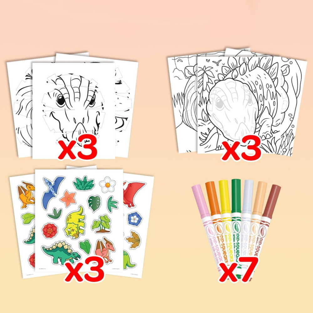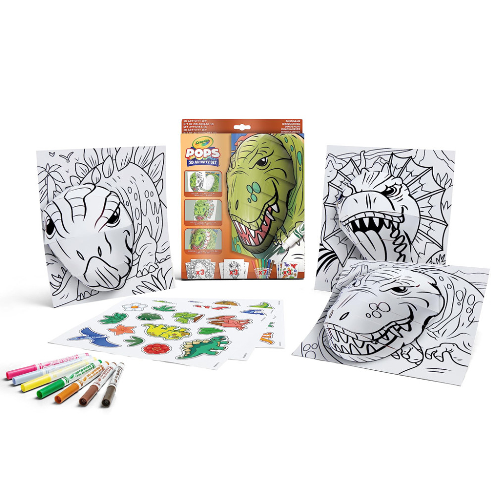 A Crayola POPs dinók tematikájú 3D foglalkoztató csomagja egy modern, innovatív technikával ismerteti meg az alkotni vágyó gyerekeket, amellyel egyszerűen háromdimenziós képeket készíthetnek. A lurkóknak nincs más dolguk, mint kiszínezni a kiváló minőségű filctollakkal a dobozban található 3 háttér egyikét, valamint a 3D-s hatáshoz szükséges lapot. Ezután “ki kell pattintaniuk” a 3D-s lap egyes részeit, majd az utasításoknak megfelelően a füleket a kijelölt helyekre illeszteniük, és már kész is a mestermű! Ha a kis művészek szeretnék még izgalmasabbá tenni az alkotást, a csomagban található matricákkal kidíszíthetik az elkészült képeket.