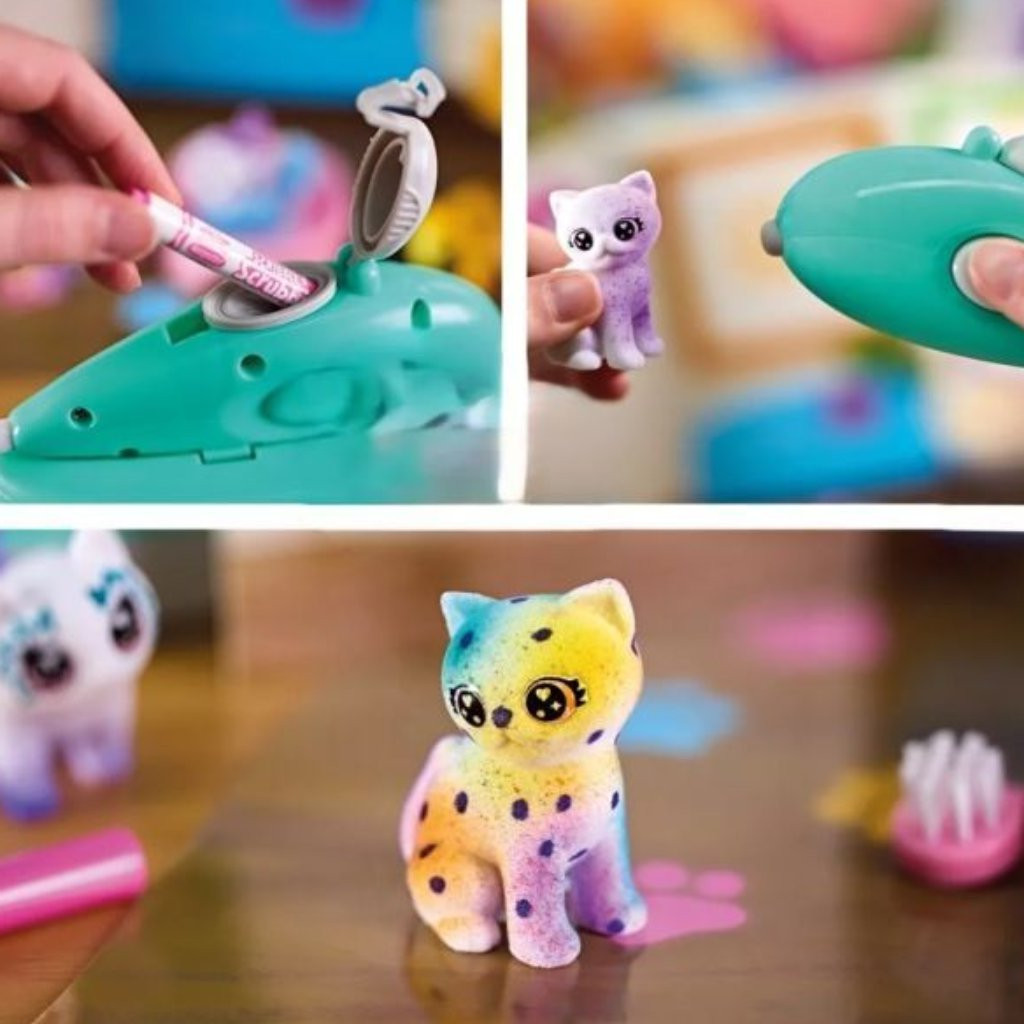A gyerekek szabadon dekorálhatják a csomagban rejlő 4 darab állatfigurát. A készlet különlegessége, hogy a filctollak a festékszóró segítségével használhatók. A még különlegesebb motívumok érdekében 3 darab mintasablon is található a szettben. Ha elkészült az alkotás, elég csak lemosni az imádnivaló kiskedvenceket és kezdődhet is elölről a móka! Még szappanra sincs szükség, elég lesz a víz és a dobozban található kis kefe.