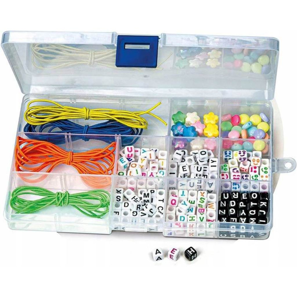 A Message karkötőkészítő szett tartalma: színes fonalak, különböző formájú gyöngyök, betűgyöngyök többféle kivitelezésben és egy részletes útmutató.