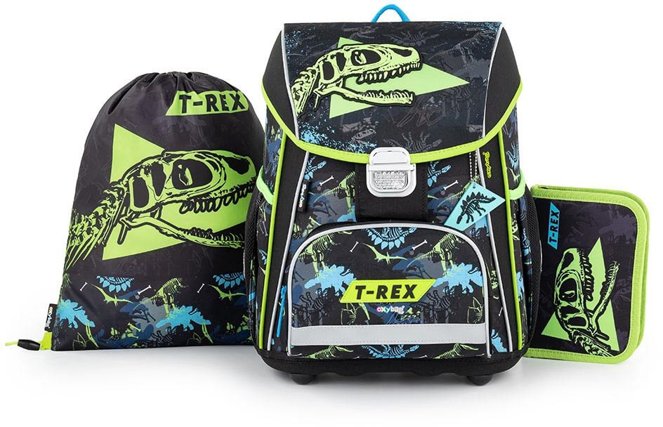 Dinoszaurusz csatos ergonómikus iskolatáska tolltartóval és tornazsákkal, T-Rex