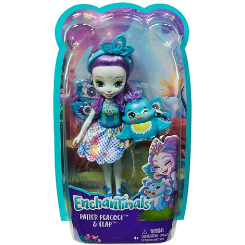 Enchantimals Patter páva baba 15 cm magas, végtagjai mozgathatóak, hosszú haja formázható. A csomag része Flap, a páva.
