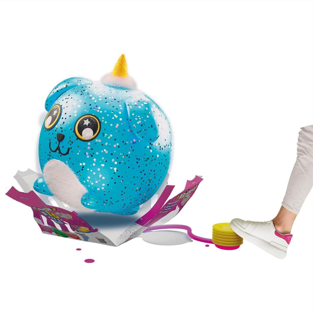 A gyerekeknek nincs más dolguk, mint lehajtani a doboz megjelölt oldalát, lábbal pumpálni, és várni, hogy az állatka akkorára dagadjon, míg végül “kitör” a szűkös otthonából. Ha a plüss elérte 45 cm-es nagyságát, indulhat is a játék: a gyerekek guríthatják, dobálhatják, pattogtathatják kedvükre. Ha vége a játéknak, csak le kell ereszteni a cuki állatkát, így a következő mókáig kis helyen tárolható.