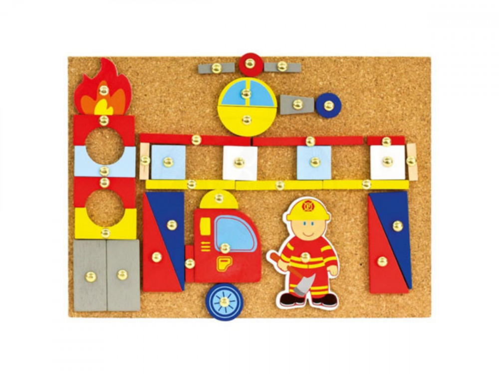Ez a szegecselhető játék különleges módon ötvözi a készségfejlesztő és a kreativitást igénylő játékokat, a tűzoltókért rajongó gyerekek legnagyobb örömére. A készletben található parafatábla adja a felületet amin a gyerekek különféle képeket alkothatnak az építőkockák felhasználásával, amelyeket egy kalapács és egy szög segítségével rögzíthetnek. A több mint hetven darab színes építőelemnek köszönhetően csak a gyerekek fantáziája szab határt a képeknek. Az időtálló fa játék teljesen biztonságos a gyerekek számára, hiszen a díszítésül használt festék vízbázisú és káros anyagoktól mentes.