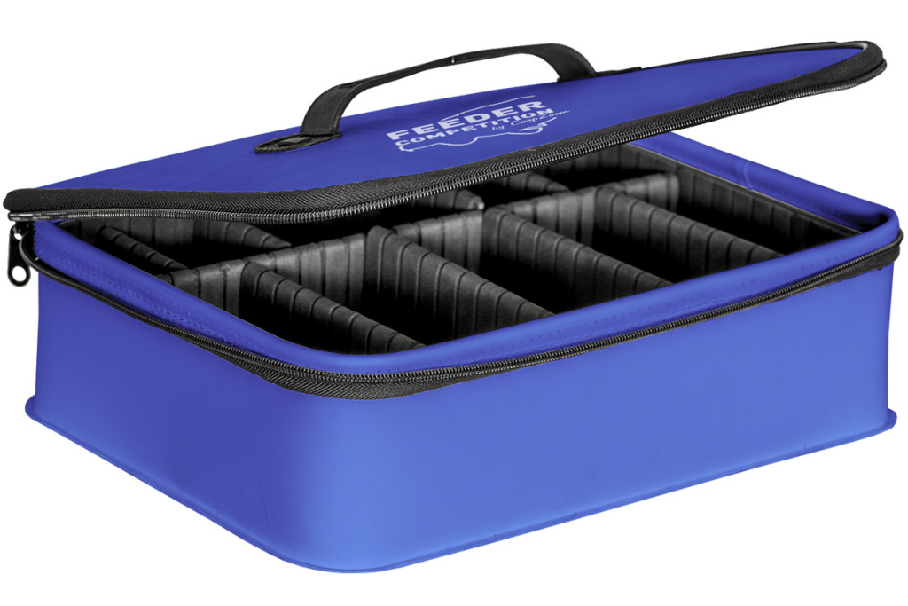 EVA anyagból készült 38x28x11 centiméteres szerelékes doboz. Fedele minőségi cipzárral zárható. Belseje a 4-4 darab 7 illetve 16 centiméteres, kivehető válaszfalnak köszönhetően változatosan alakítható. Az igényes, szivacsozott belső részben a válaszfalak 1,5 centiméteres osztásokban variálhatóak, így az aprócikken át a nagyobb kiegészítőkig mindent elnyel. Elsősorban feeder horgászoknak ajánljuk, de a Feeder Competition EVA Sortiment szerelékes dobozban minden olyan horgász örömét leli, aki szereti rendben tartani a kiegészítőit.