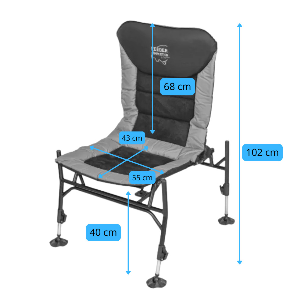 A nagy teherbírású acél vázzal szerelt Feeder Competition Super Feeder horgászszék párnázott, ergonomikus kialakítású. A lábak hossza a talaj egyenetlenségeihez igazítva tetszőlegesen állíthatóak. Dönthető talpakkal szerelte fel a gyártó, így sáros, egyenetlen terepen is stabil ülést biztosít. A kimondottan kényelmes ülőrészről könnyű felkelni, így hirtelen kapás esetén egy szempillantás alatt reagálhatunk még akkor is, ha a bot távolabb található. Feeder horgászathoz, bojlizáshoz, de akár klasszikus fenekező horgászathoz is kítűnő választás a Super Feeder horgászszék.