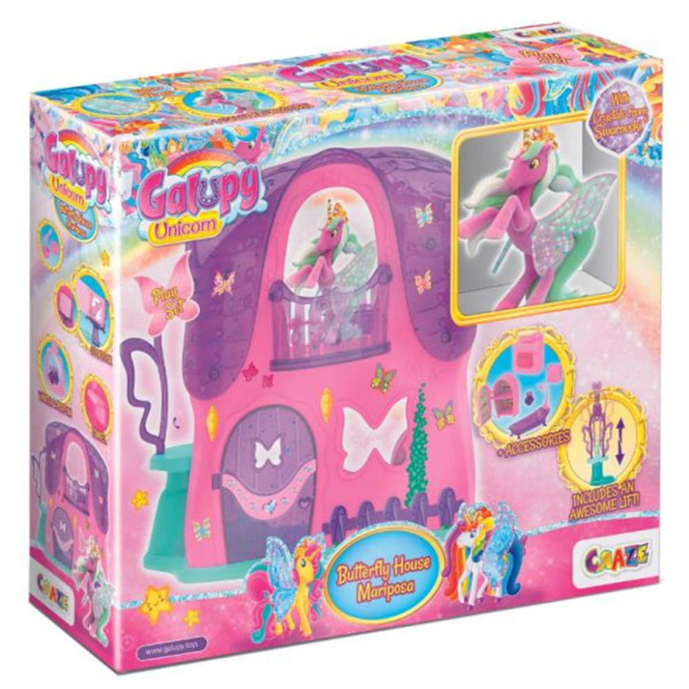 Tartalom: 1 pillangó ház lifttel, 1 db Galupy unikornis figura, berendezési tárgyak (pl. szekrény, tűzhely, kád) matricák.