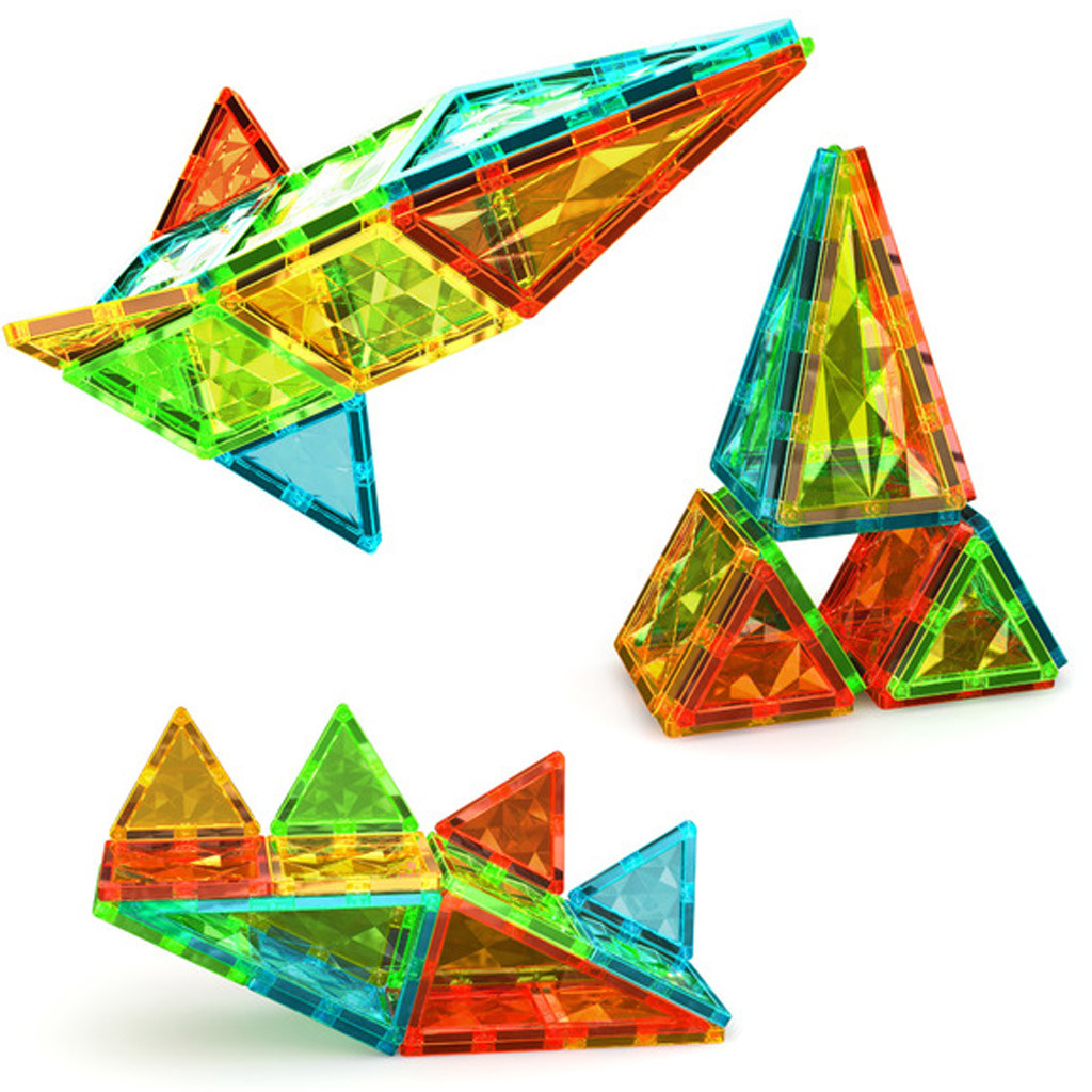 Geomag Magnetic Tiles Gems 16 darabos mágneses építőjáték tartalma: 8 db négyzet (7,5 x 7,5 cm), 4 db szabályos háromszög (7 x 7 x 7 cm), 4 db hegyesszögű háromszög (7 x 14 x 14 cm). A Geomag Magnetic Tiles Gems 16 darabos mágneses építő minden eleme mágneses. Tartós, minőségi anyaghasználat, erős mágneses kapcsolódás.
