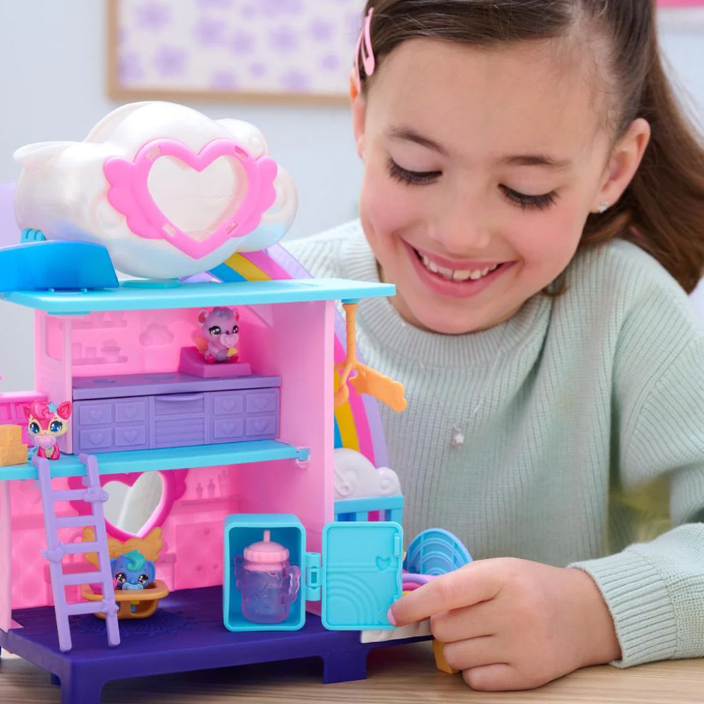 Ha a gyerekek szorgalmasan gondoskodnak a tojásokról – azaz belehelyezik őket a felhőmedencébe, majd megtöltik azt vízzel -, a szemük láttára kel majd ki a cuki zsiráf, róka vagy épp más figura. Ezután kezdődhet a móka: a kis figurák lecsúszhatnak a csúszdán, megpihenhetnek a kényelmes ágyikóban, a hűtőből kereshetnek maguknak némi innivalót vagy játszhatnak az oviban rejlő játékokkal.