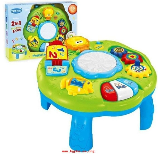 Oktató és zenélő játszóasztal, ami megtanít a színekre és a formákra is! A 2 az 1-ben Zenélő bébi játszóasztal játékos formán tanítja meg a gyerekeket a számokra, az állatokra a színekre és a formákra is. Az asztal műanyagból készült, és rengeteg meglepetést tartogat. A lapozgató könyv az ABC és a számok világába kalauzolja el a picit, a zongorabillentyűkkel különböző zenéket tud a kisasztal lejátszani, a halacska és a tekerős játék pedig csattogó-kattogó hangot ad ki magából. Az asztal közepén lévő dob világít, az oroszlánt felhajtva egy tükör tűnik elő. A Zenélő bébi játszóasztal fejleszti az érzékszerveket, mozgásra ingerli a picit. Az asztal a babaágyra is felakasztható. A játék 3 db AA ceruzaelemmel működik, a csomagolás az elemeket nem tartalmazza. Asztal átmérője: 33 cm.