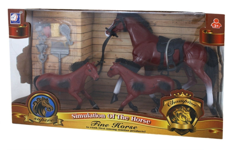 Csodálatos családi lovas készlet. A csomag 3 lovat tartalmaz (nagyság 1×19 cm, 2×9 cm) és kellékeket. 3 éves kortól ajánlott. Paraméterek:335×215×115 mm