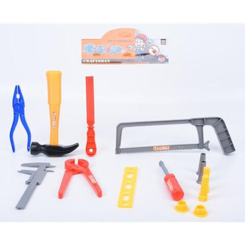 14 db szerszám, kalapács, fogó, reszelő, csavarhúzó, tolómérő, fűrész, csípőfogó, 2 db csavar, 2 db csavaranya, 2db alátét