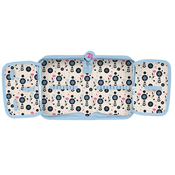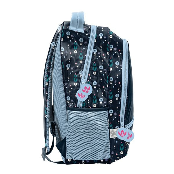 A Frozen hátizsáknak 2 cipzárral záródó rekesze van. Elől egy kisebb zsebbe lehet elhelyezni, tolltartót egyéb eszközöket. A cipzár fogantyúja díszes gumiembléma. Oldalt további hálós zsebek találhatóak, melyek alkalmasak kulacs, termosz tárolására.