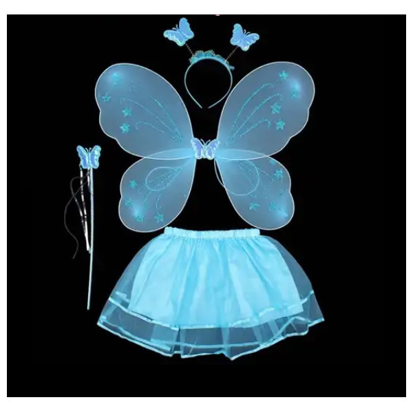 Pillangó jelmez. Tartalma: Szárny – szalaggal rögzíthatő a hátra, tüll szoknya – gumírozott, pálca, fejdísz.