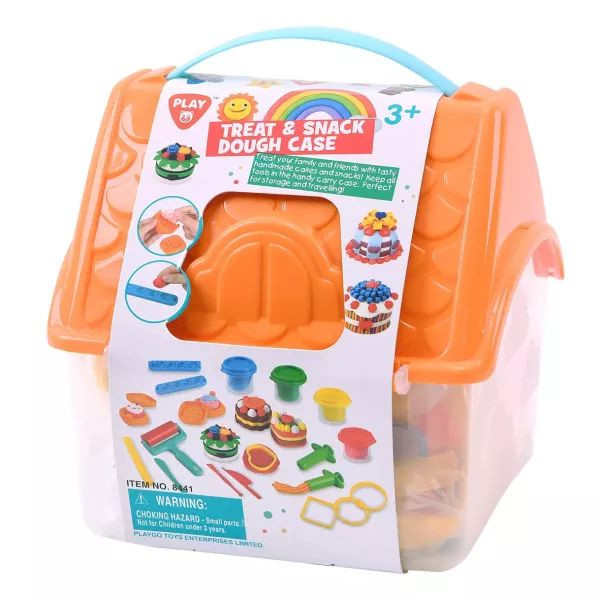 Torta- és sütibár gyurmakészlet házikó alakú tárolóban. A készlet tartalmaz 4 különböző színű gyurmát, nyújtóhengert, különféle gyurmakéseket, süti gyurmaformákat, kinyomókat, sablonokat és kiszúró formákat.