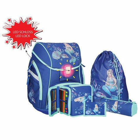 Jellemzők: Sellő iskolatáska szett 5 db-os kiváló minőség ergonomikus kialakítás fényvisszaverő elemekkel LED-es csatos zárral párnázott hátfallal pénztárcával, tolltartókkal és tornazsákkal Kor: 6+