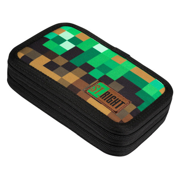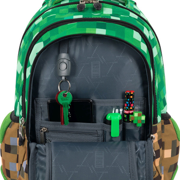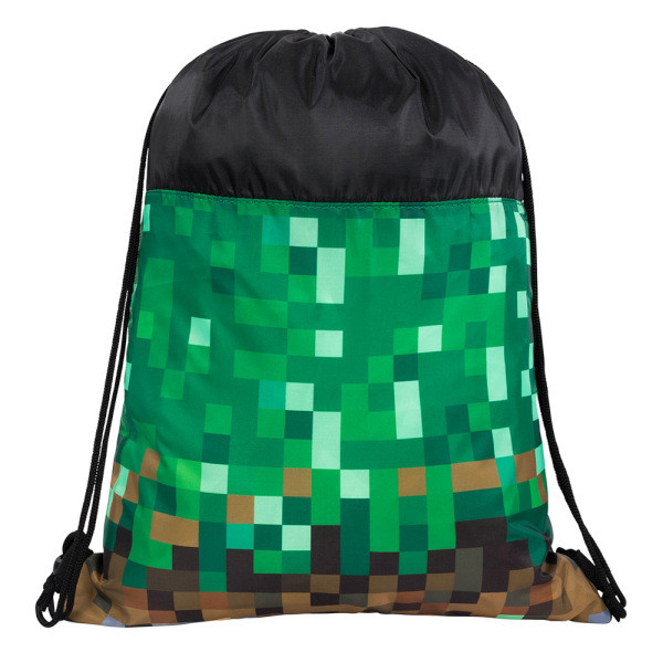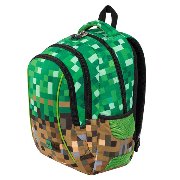 A színes kockákkal mintázott iskolatáska gamereknek készült. A barna, és a zöld különböző árnyalataiban játszó pixel kockák a Minecraft játék kedvelőinek biztosan tetszeni fognak.