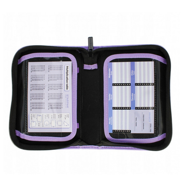 A tolltartó nem felszerelt, 24 db gumipánt írószereknek, 3 db gumipánt egyéb eszközöknek, kihajtható füleken átlátszó zsebek órarendnek.
