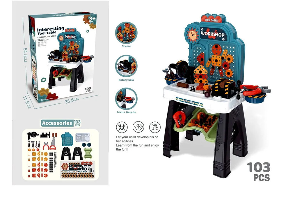 Az összerakható szerszámtartó asztal tökéletes hely a munkához, de a játék végeztével praktikus tárolóhelyként is szolgál az eszközöknek, megtanítva a gyerekeket a rendrakás fontosságára.