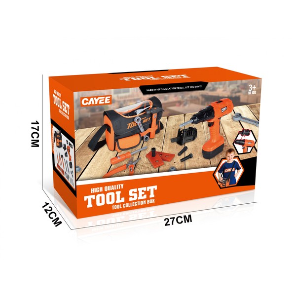 Tartalom: 1 db szerszámos táska, 1 db játék csavarhúzó, 1 db csavarhúzó, 1 db fúró, 1 db fogó, 1 db kalapács, 1 db csavarkulcs, 3 db anyacsavar, 2 db aljzat, 3 db csavar, 3 db csavarhúzó fej, 1 db egyéb. A játék elemmel működik (3 x AA). Az elemek nincsenek benne a csomagban.
