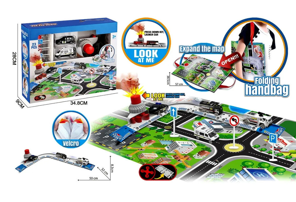A csomagban található két strapabíró fém rendőrautó a város biztonságának őrzésére vár. A járművek realisztikus kialakítása hozzáadja a játékhoz a valósághűség érzését. A játékot egy autókilövő katapult is kiegészíti, amivel a gyerekek képesek a legizgalmasabb üldözési jeleneteket eljátszani, és a rendőrautók a levegőbe is repülhetnek!