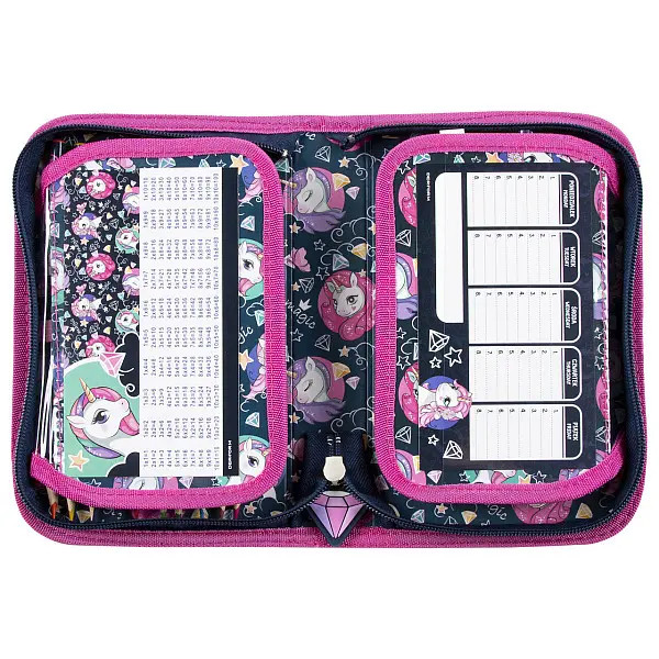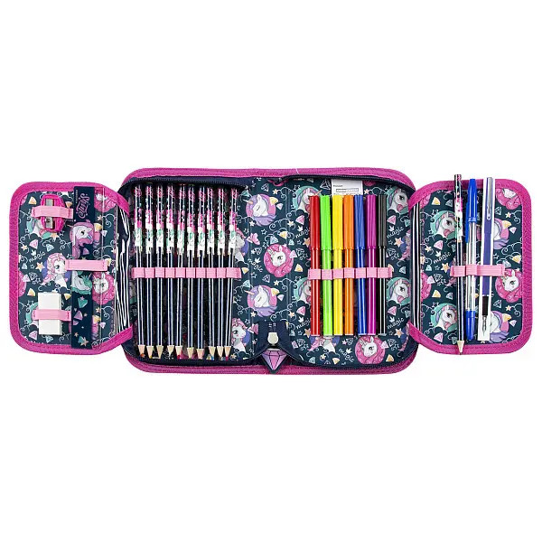 Unikornisos iskolatáska SZETT – Dream Unicorn Unikornisos merevfalú iskolatáska lányoknak + felszerelt tolltartó   Az iskolatáska sötétkék színe az éjszakai égboltot idézi, melyen egy meseszép unikornis szárnyal keresztül. A látványos mintázatú, unikornisos iskolatáska ideális választás lesz elsős kislányok részére, hiszen a divatos, trendi minta mindenkit elvarázsol. A dobozos kialakítású iskolatáska könnyen pakolható az első osztályosok számára, praktikus belső elrendezése és külső zsebei miatt kényelmesen elférnek benne az iskolaszerek. Az ergonomikus, párnázott hátkiképzés segíti a helyes testtartást és védi a gerincet, ami kisiskolás korban kiemelten fontos. Az iskolatáska szett tartalma az ergonomikus iskolatáska, az emeletes felszerelt tolltartó Unikornis ergonomikus iskolatáska jellemzői: – Merev falú, dobozos iskolatáska – 1  nagy rekesszel rendelkezik, benne füzetelválasztó – A rekesz cipzárral záródik – Oldalán 1 hálós és egy cipzáras zsebbel – Elején egy kisebb cipzáras zseb – Alja gumiborítással megerősítve – Állítható párnázott vállpántok – A gerinc mentén elhelyezett párnák megvédik a gerincet, csípőnél párnázott – A vállpántján és oldalain fényvisszaverő csík van elhelyezve a jól láthatóságért – Felszerelt emeletes tolltartó /– 2 db grafit ceruza– 10 db színes ceruza – 10 db filctoll – vonalzó – órarend, radír, hegyező, notesz – cipzár húzója selymes /   Méret: 36,5 x 28 x 16,5 cm ( zsebek nélkül ) Súly: kb 1 kg Minta: Unikornis, pegazus Gyártó: Derform