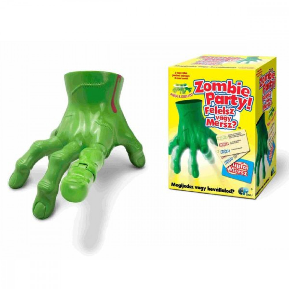 Ebben az izgalmas társasjátékban a mókás és egyben ijesztő Zombie kézé lesz a főszerep! A kéz magától körbejárja az asztalt és véletlenszerűen kiválaszt egy játékost, aki eldöntheti, hogy válaszol-e a “Felelsz” kérdésre, vagy inkább szembenéz a “Mersz” feladattal. Ha a többi játékos úgy dönt, hogy az éppen soron lévő elbukta a kihívást, akkor be kell vállalnia a “Fizess” kihívást. Minden sikeres kör esetén megtarthatjuk az aktuális kártyalapot és ha sikerül 6db-ot összegyűjteni, miénk a győzelem. 2 vagy több játékos részére!